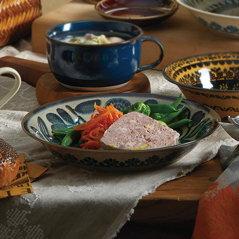 融合日本民藝的溫暖質感與北歐的復古風情,展現出懷舊卻新穎的經典風格,來自 Aito 的美麗深盤,手繪圖案充滿韻味,簡約設計中透露優雅氣息,盛裝咖哩、燉飯、義大利麵等帶湯汁的料理都適合,為餐桌增添獨特韻味。