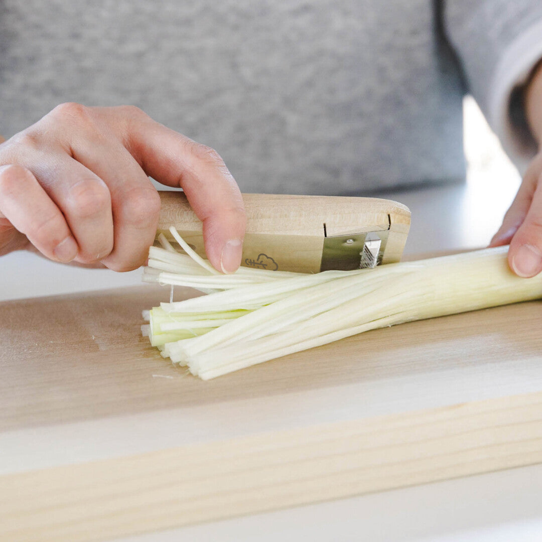 這款由日本「小柳產業」出品青蔥專用刨絲刀,造型簡單,方便易用。使用燕三条的高品質不鏽鋼打造,銳利刀片只需輕輕一劃,便能有效快速地刨出餐廳等級的細細葱絲,木柄的握感也十分好,用過一次就能深深體悟「工欲善其事,必先利其器」的重要性。將美麗的蔥絲放在拉麵、蒸魚、涼拌小菜上為餐點畫龍點睛,簡單一小步驟卻能提升整道菜的層次。