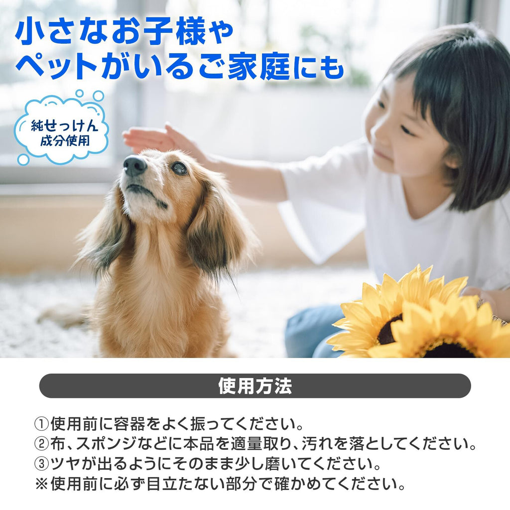 將清潔與上光功能合而為一,一瓶即可完成多重效果,無需再次擦拭,讓日常清掃更加輕鬆。採用純石鹼成分,不含研磨劑,溫和不傷材質,適合有小孩與寵物的家庭安心使用。無論是沙發、鞋櫃或各種居家表面,都能快速恢復潔淨與光澤,是打造亮麗居家的實用清潔好幫手。