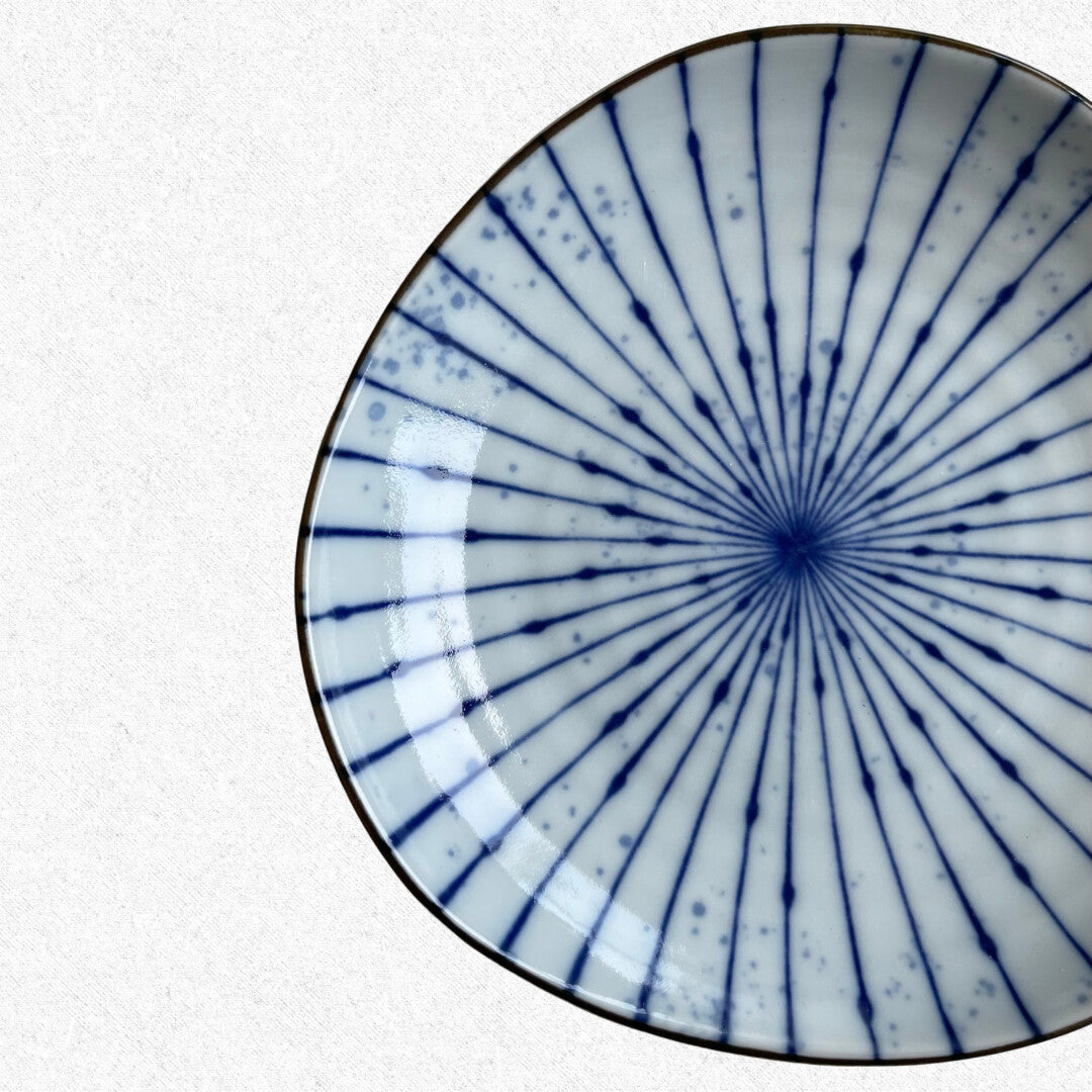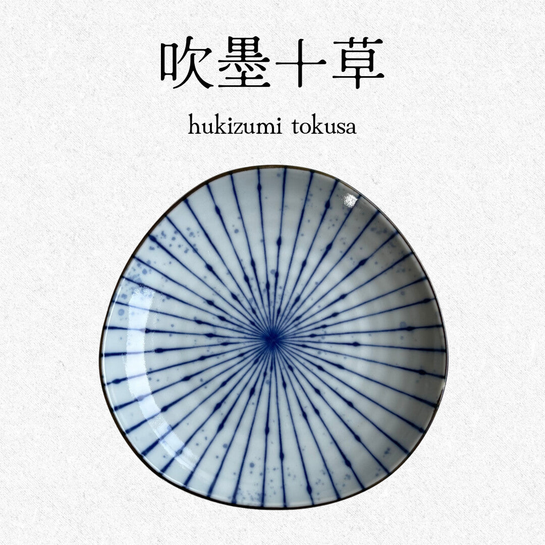 Combines flowing Tokusa stripe patterns with the delicate fukizumi (blown ink) technique, creating a richly layered and elegant indigo-and-white design. The refreshing color palette exudes a sense of calm, while the triangular shape adds a playful and distinctive touch. Perfect for serving everyday meals or special dishes for guests, it brings a unique Japanese charm and refined style to any dining table.