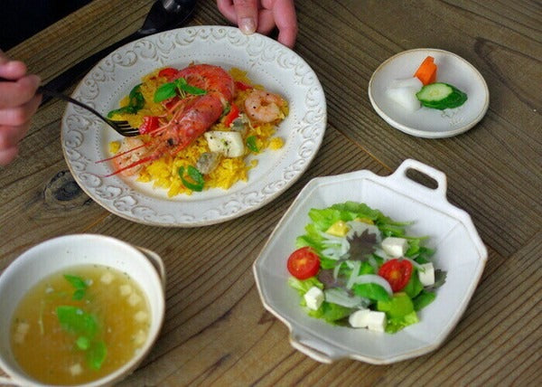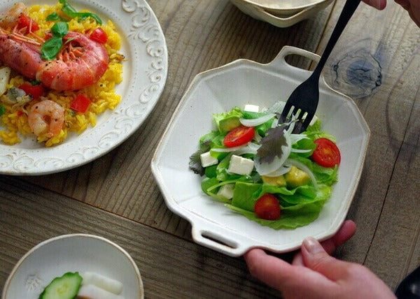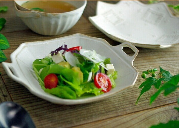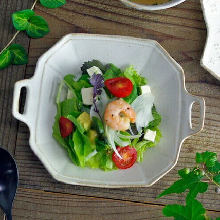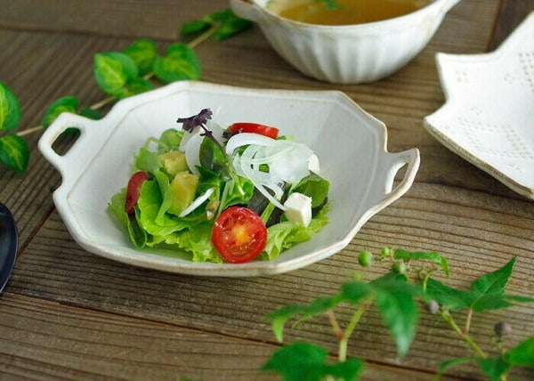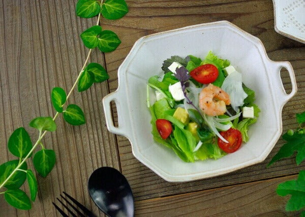 來自日本益子燒的細膩手工製作,擁有簡約可愛小手把的八角造型設計,展現陶器的溫潤質感。實用的器型與尺寸,用來盛裝沙拉、水果、甜點都非常合適,為日常餐桌增添一份質樸與優雅。