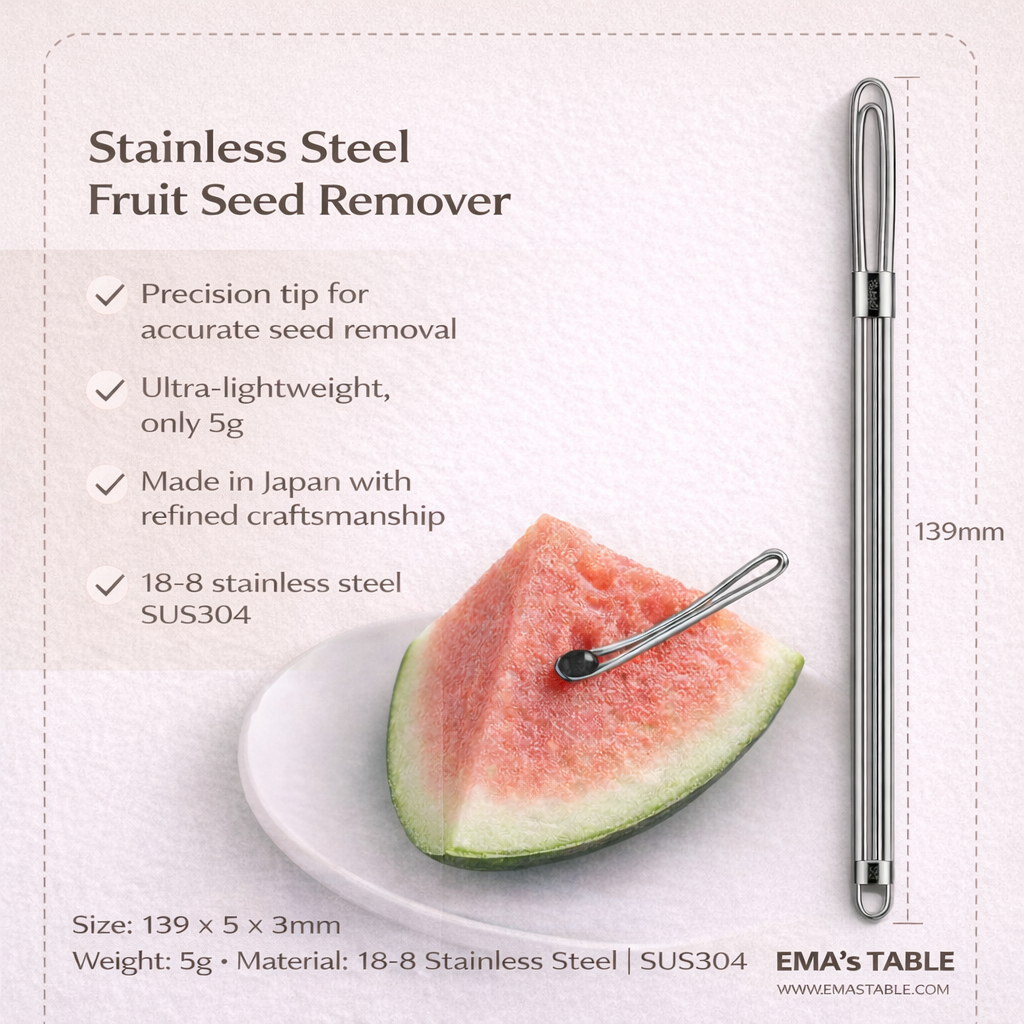 Enjoying watermelon, papaya, or dragon fruit should be effortless — not interrupted by seeds. This Japanese-made stainless steel fruit seed remover is designed to delicately lift seeds out with a single gentle motion, keeping the fruit intact and beautifully presented.