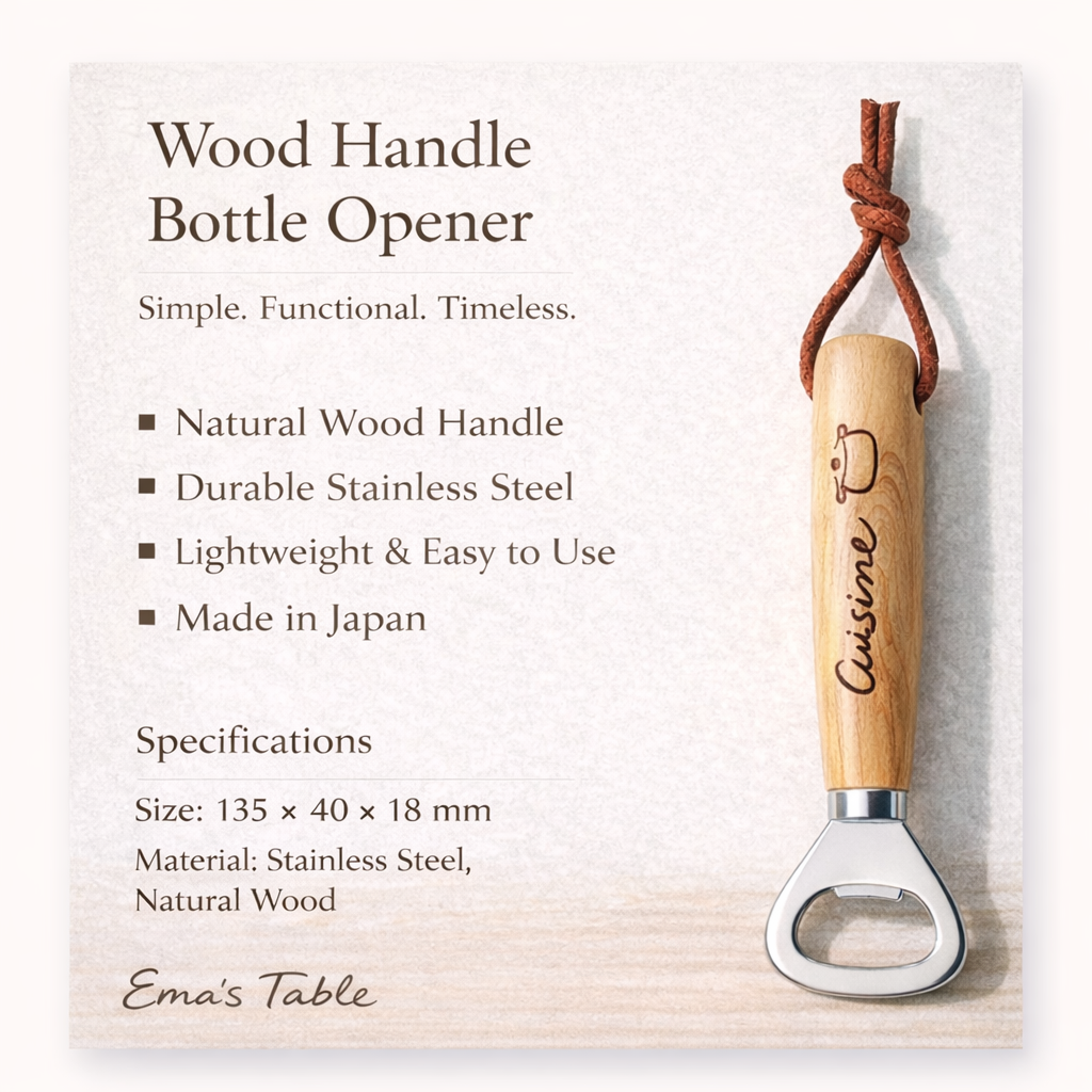 This Wood Handle Stainless Steel Bottle Opener blends Japanese craftsmanship with everyday practicality. The natural wood handle offers a warm, comfortable grip, while the stainless steel opener ensures durability and effortless use.