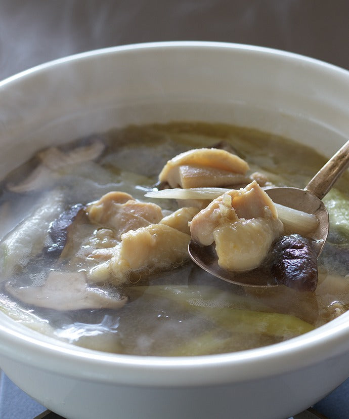 以雞骨高湯為基底,融合生薑清香與鹽麴的溫潤甘味,呈現濃郁卻溫和的養生滋味。只需將雞腿肉短暫醃漬後入鍋烹煮,即能享受肉質鮮嫩、湯頭醇厚的參鷄湯風味。單人份小包裝設計,就算只有自己在家也能快速開鍋,享受療癒暖心料理。