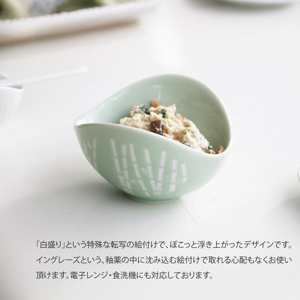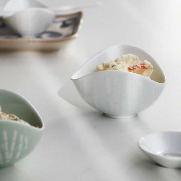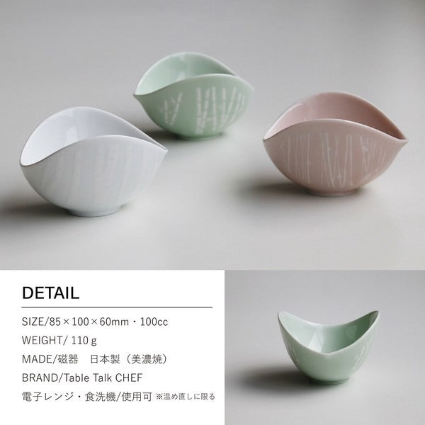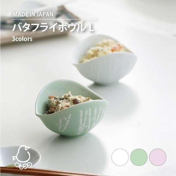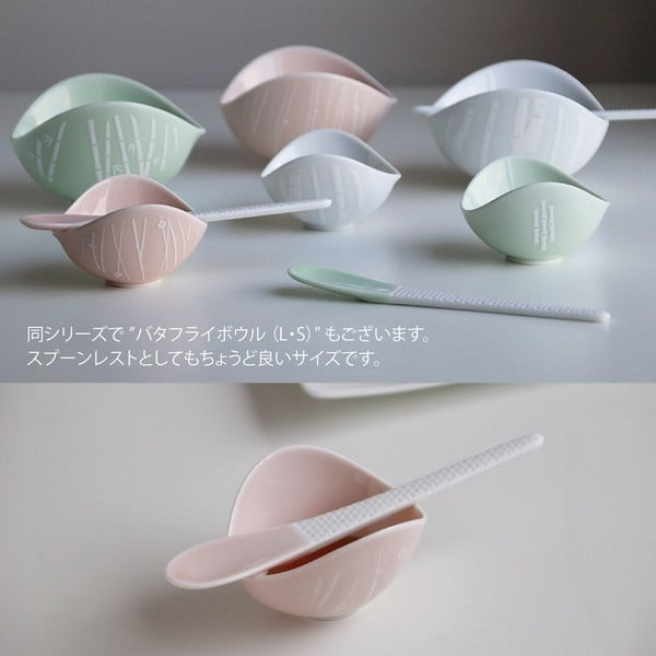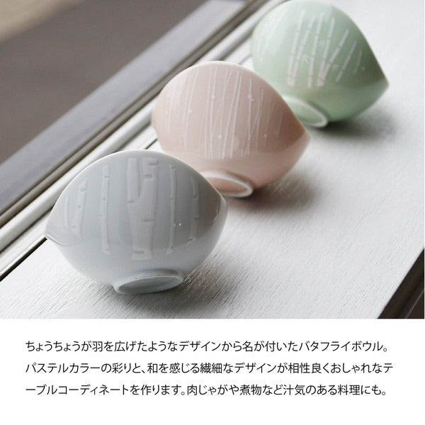 以展翅蝴蝶為靈感設計,盛裝料理時,宛如翅膀包覆著小菜,展現優雅曲線之美。碗緣的凹處可巧妙放置湯匙,兼具實用與設計感。柔和的粉彩色系結合細緻日式圖案,為日常餐桌增添一抹溫柔風景。