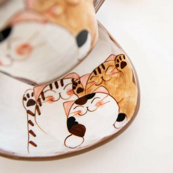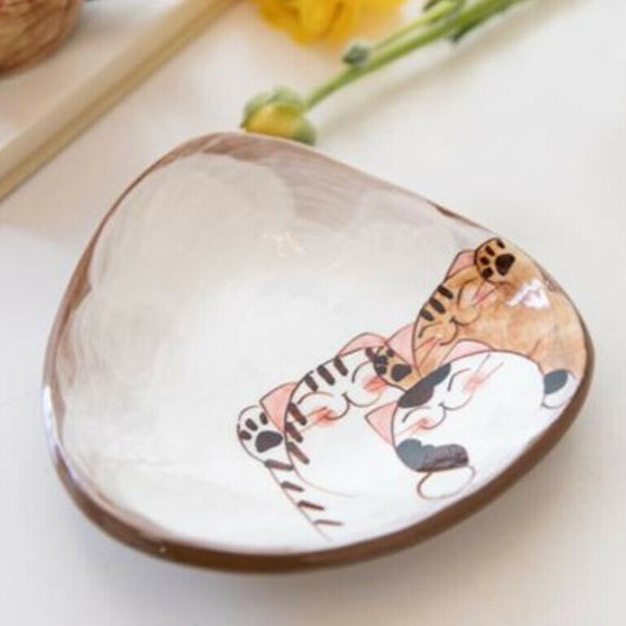 Designed with soft rounded corners and gently raised edges, this triangular plate is perfect for dishes with sauces—practical and spill-resistant. The surface features three cheerful cats with charming expressions, creating a warm and soothing impression. Ideal as a small serving plate or a delightful decorative piece, it's a heart-stealer at first glance.