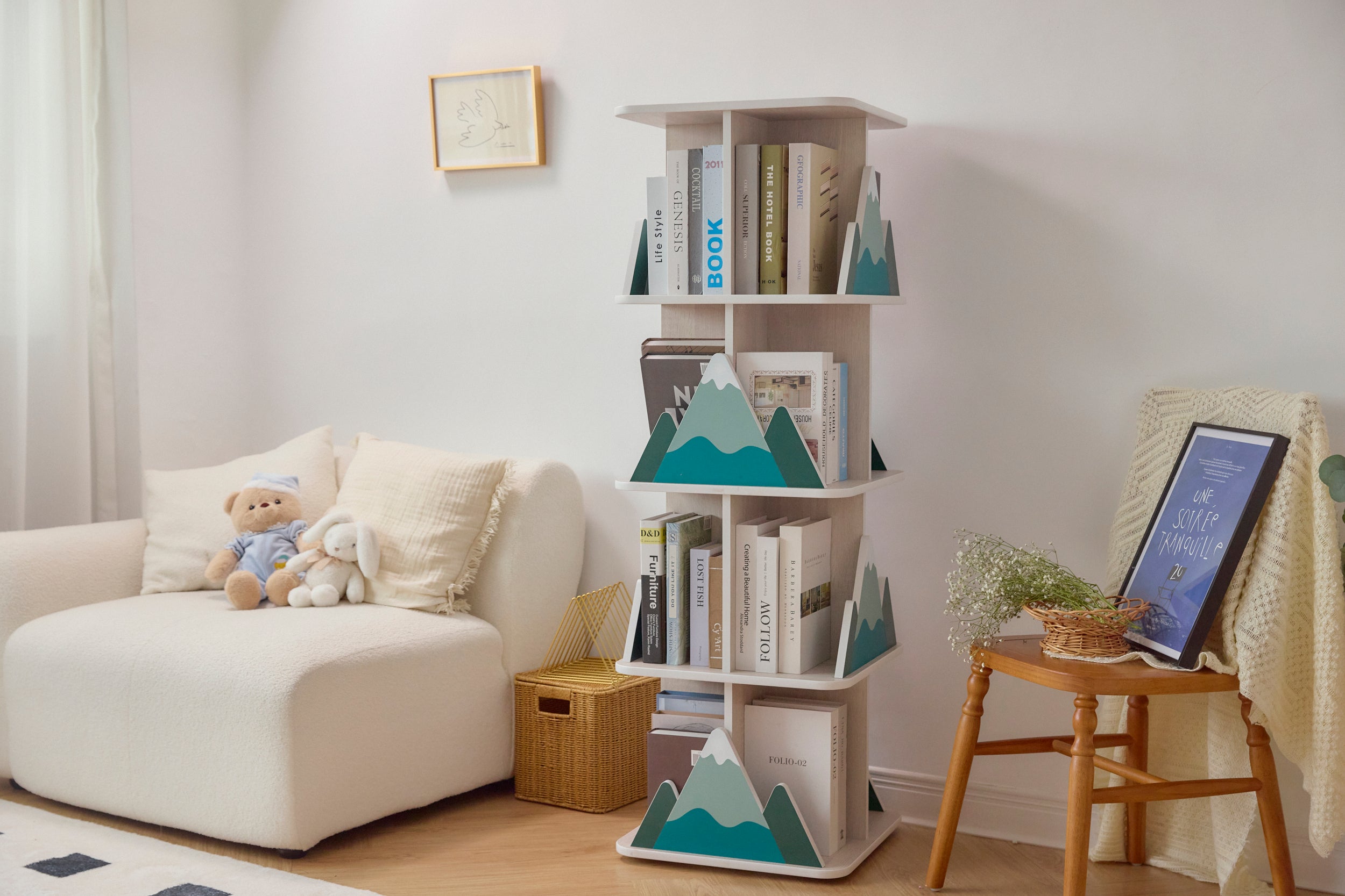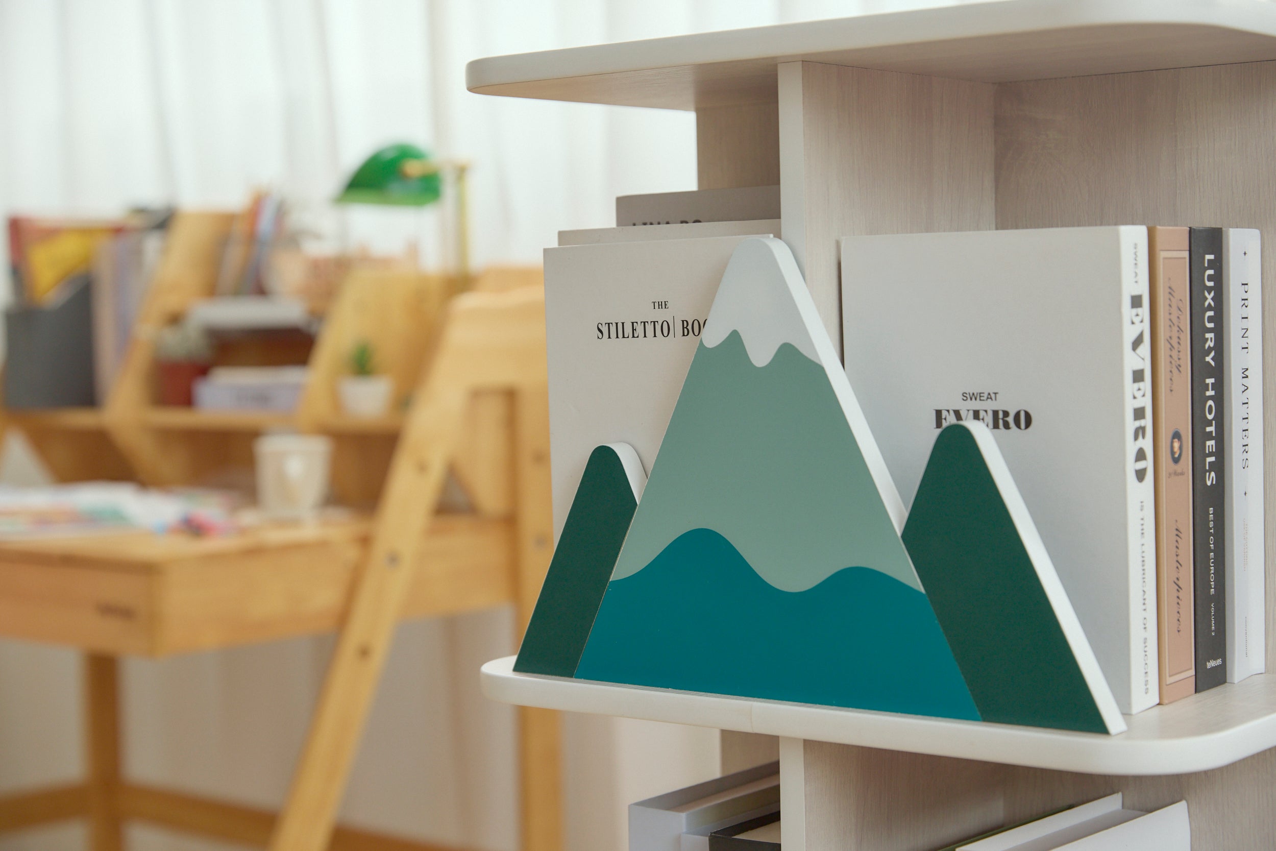 可愛山造型擋板,收納的同時也在展示書籍,能輕鬆融入各種室內風格。木紋貼皮採特殊粗糙表面處理,即使小朋友抓刮也不易損壞。