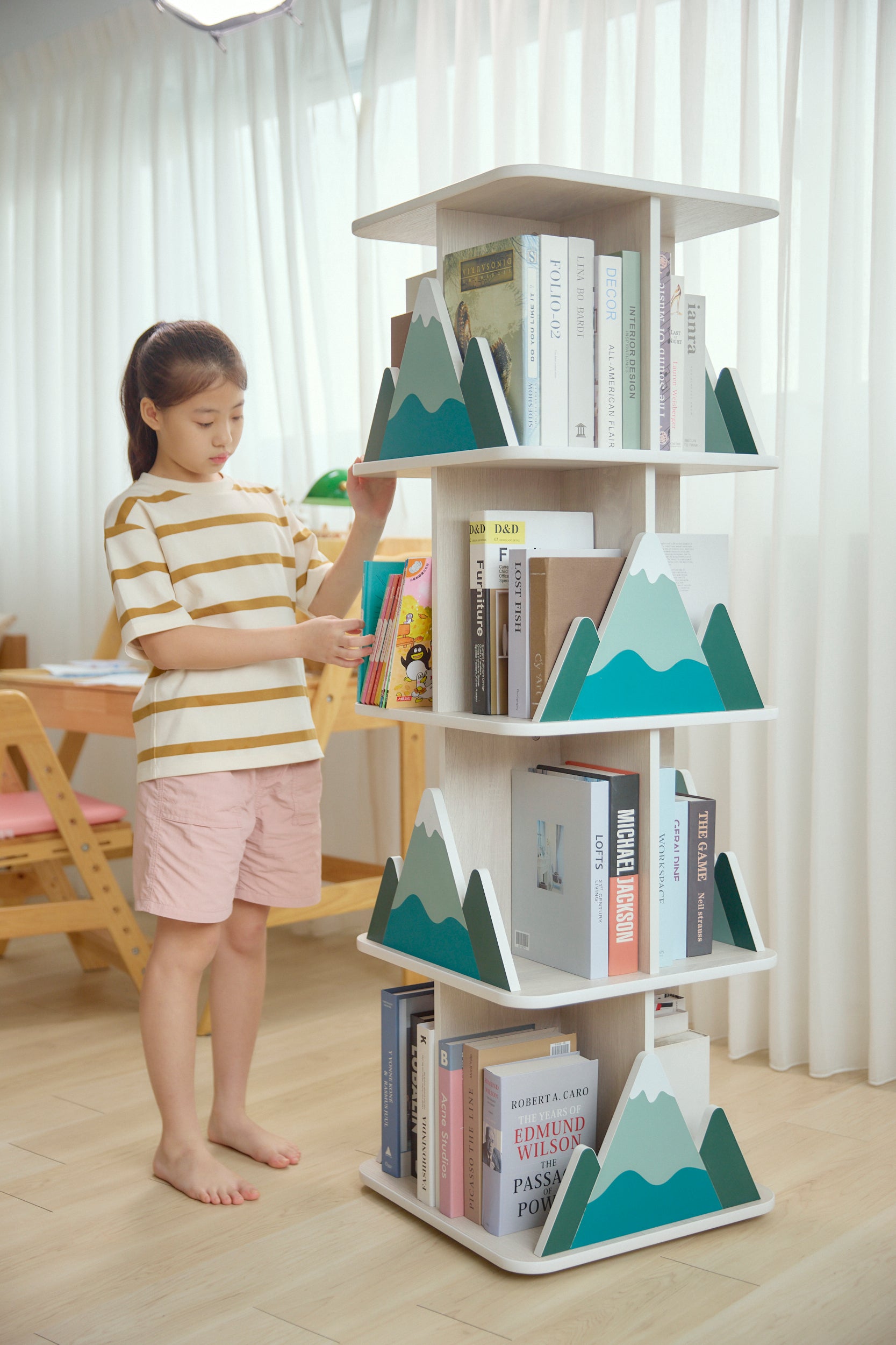 書櫃可全方位旋轉,方便從任何角度輕鬆拿取,不會因書太多太重造成孩子取書困難,使用體驗友善又直覺,培養自主收納的好習慣。