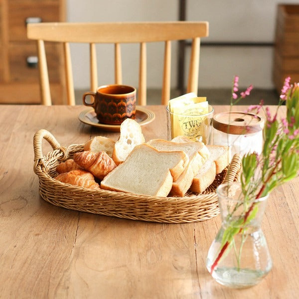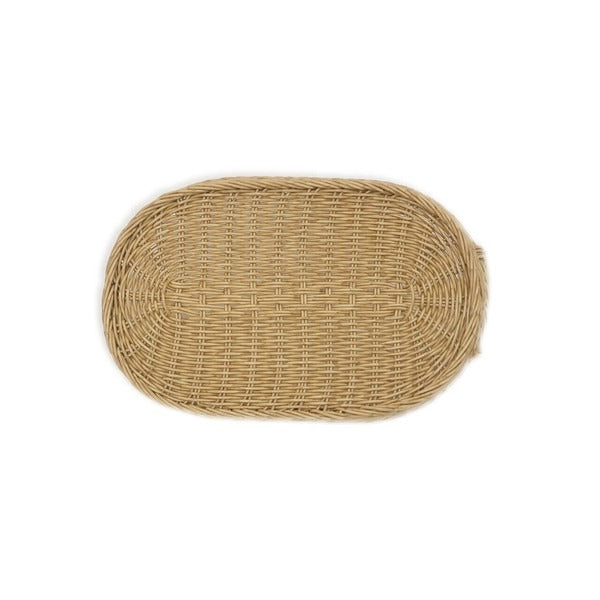 採用耐水材質編織而成,宛如天然素材般的編織質感,展現自然溫潤的氛圍。楕圓造型適合用於早餐或下午茶時光,擺放麵包、點心與飲品都恰到好處,也能用來收納小物,點綴生活角落,是結合實用與美感的理想托盤。