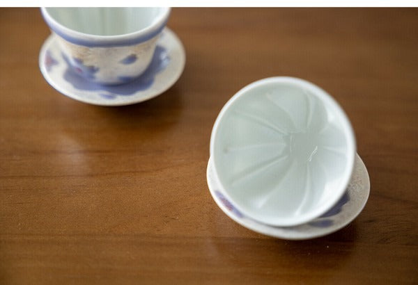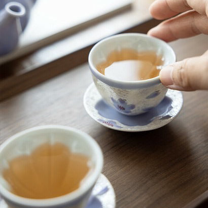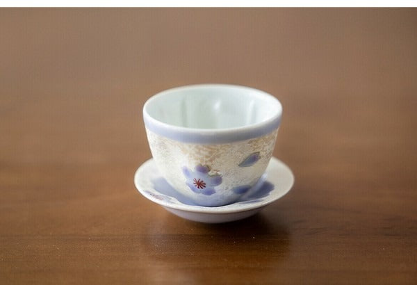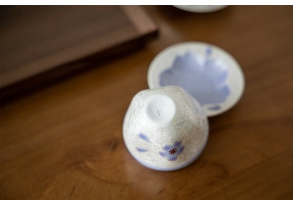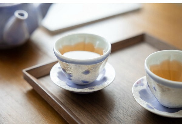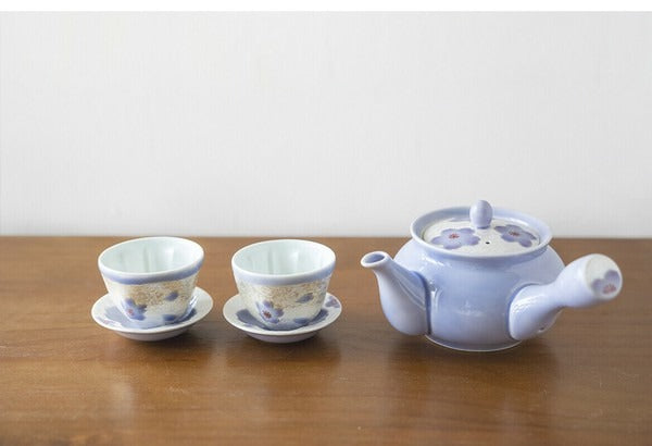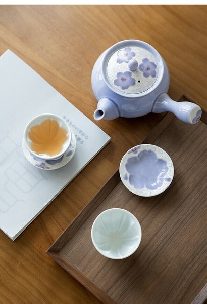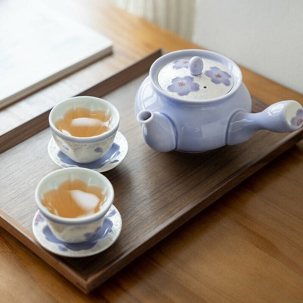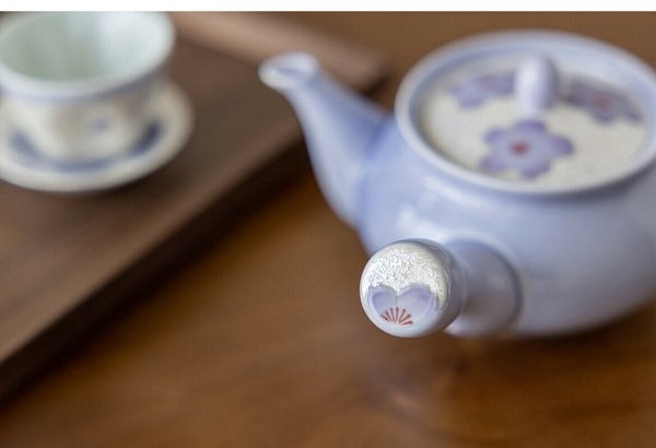 Crafted by Tasei Kiln in the tradition of Arita ware, this refined tea set features delicate hand-painted cherry blossoms in soft lilac tones. Iridescent glazing on the teapot lid and teacup exterior adds a gentle shimmer under the light. When hot tea is poured, a hidden sakura motif subtly emerges from the base of the cup—a poetic and delightful surprise. Complete with a petite teapot, matching cup, and saucer, this set brings a touch of gentle elegance to tea moments, making it a perfect gift or personal indulgence.