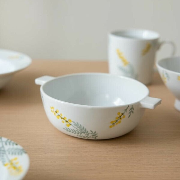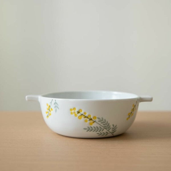 This Japanese-style gratin bowl features vibrant yellow mimosa accents that bring warmth and charm to your table. Its double-handle design ensures easy handling, making it perfect for gratin, salads, soups, or sharing hot pot dishes. Practical and visually pleasing, we recommend having several to effortlessly create an elegant dining experience.