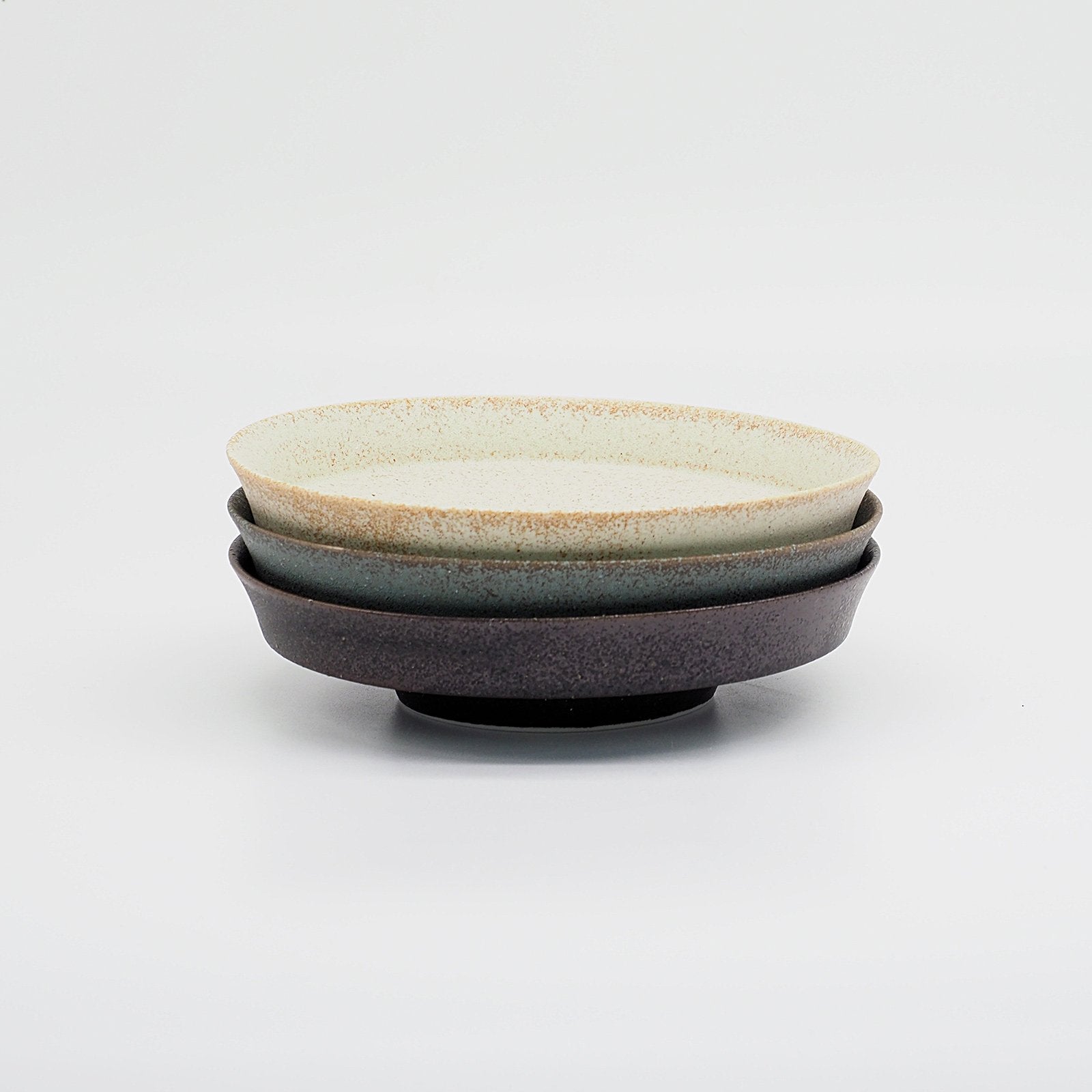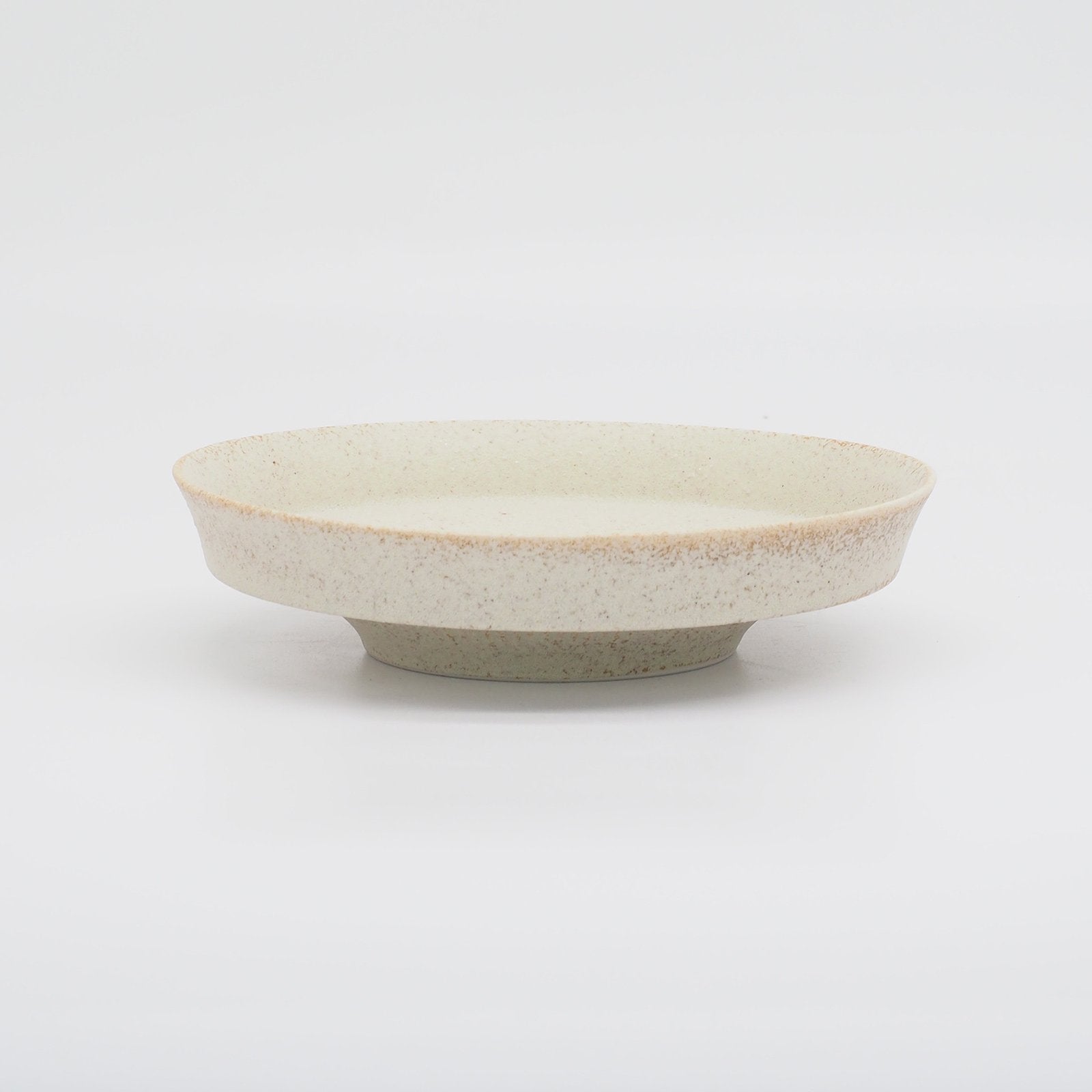 Designed with a gently concave base, this dish naturally guides your plating—simply follow the curve and your food looks beautifully arranged, almost like it was styled by a chef. The tall footed base and subtly textured matte finish add a calm, refined character that enhances any dish. With its higher rim and deeper form, it securely holds liquid dishes or large portions of side dishes.. A charming deep plate that balances aesthetics and everyday practicality.