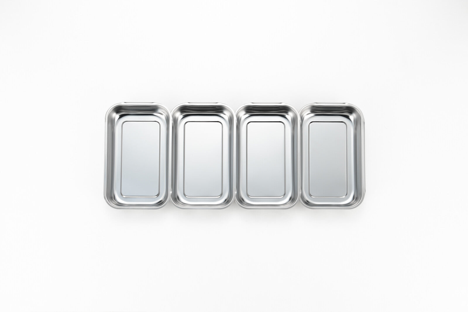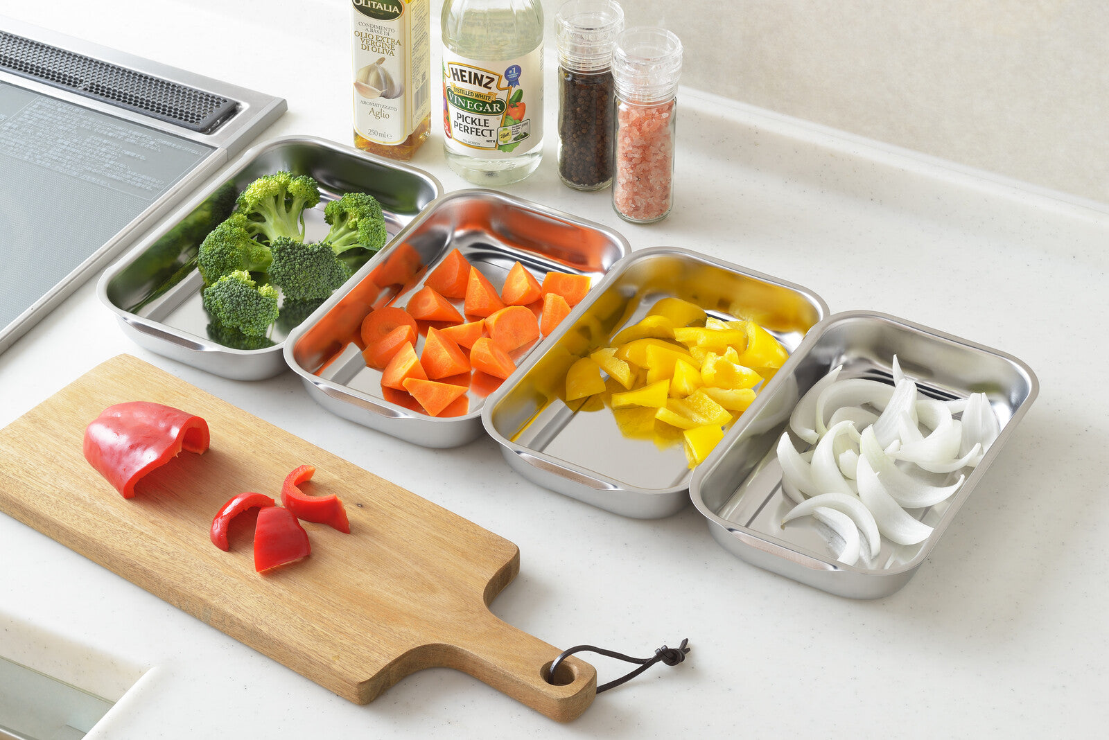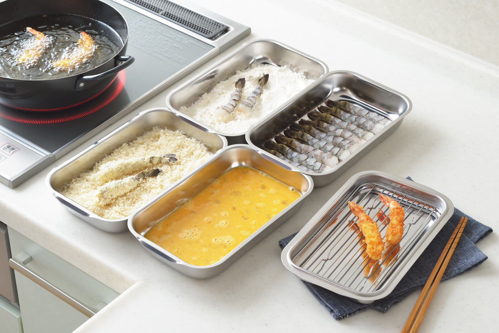 此組包含 4 個連結備料盤、1 個可當盤的蓋子與 1 個炸物瀝油網,讓備料更有條理。可依檯面空間直向或橫向自由連接,靈活調整使用方式,無論是裹粉完成的食材、等待下鍋的炸物,或各階段備料分區擺放都井然有序,讓下廚動線更順手。