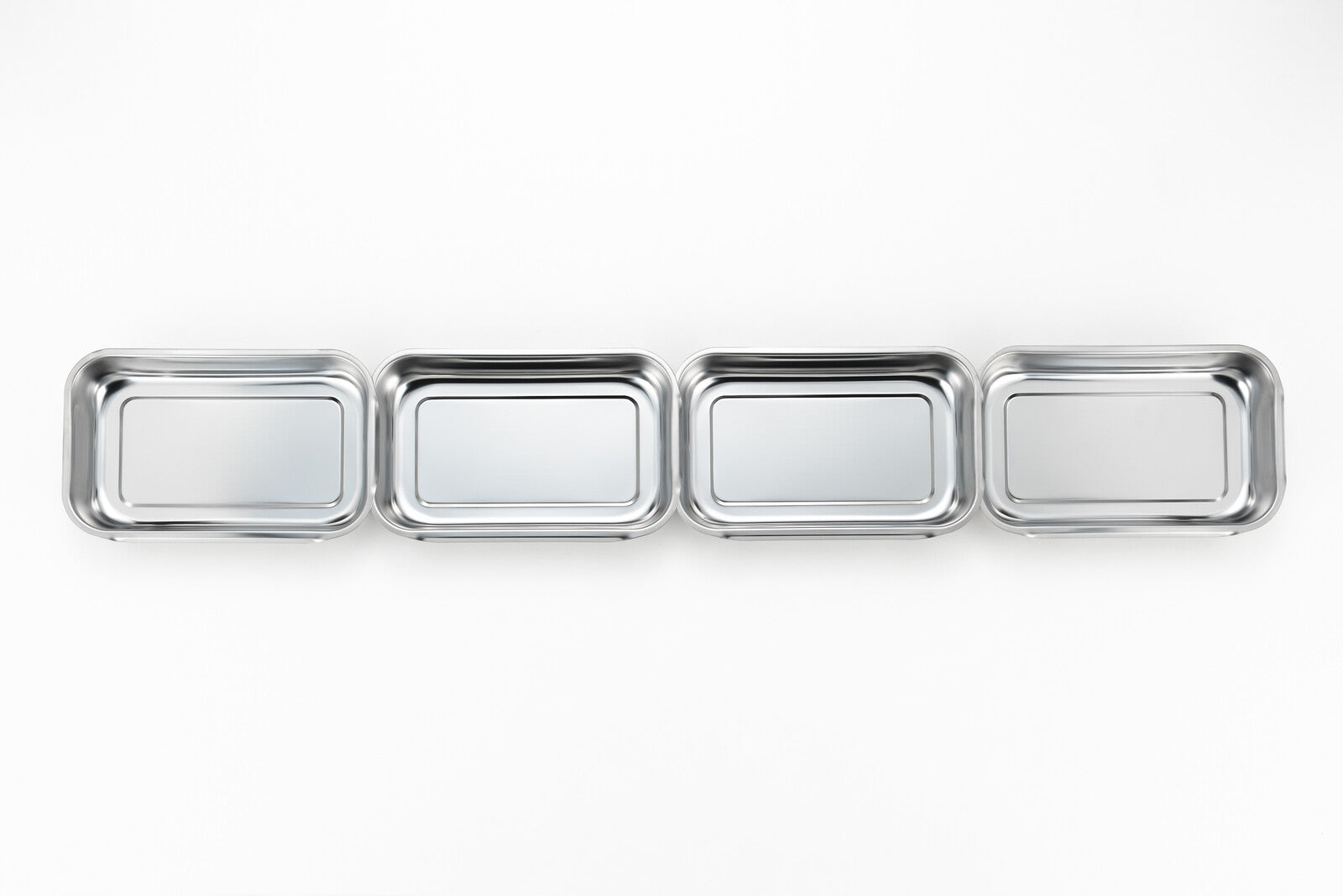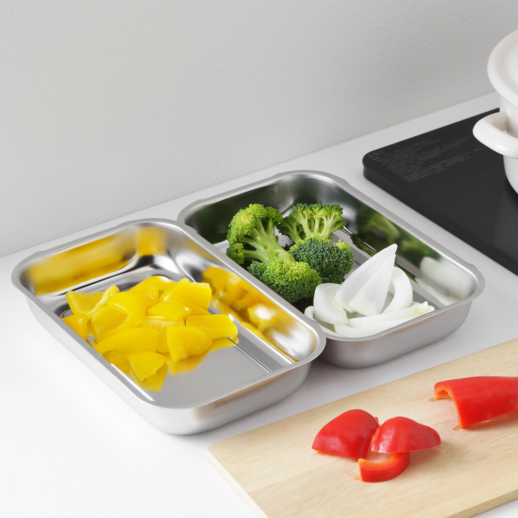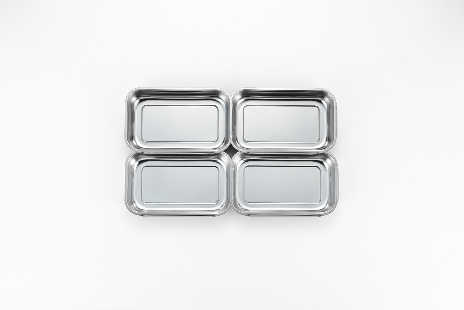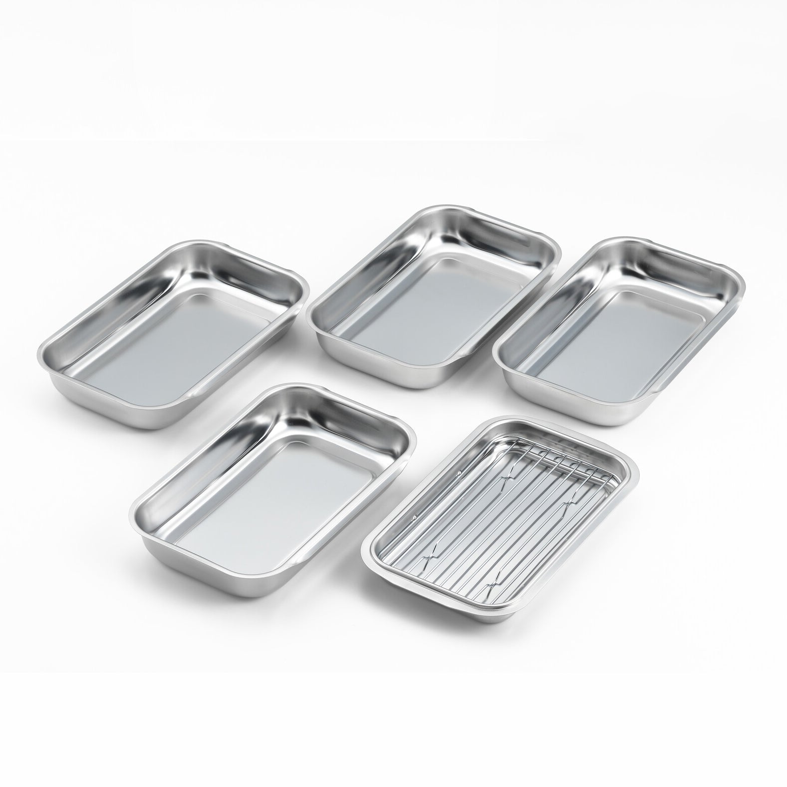 此組包含 4 個連結備料盤、1 個可當盤的蓋子與 1 個炸物瀝油網,讓備料更有條理。可依檯面空間直向或橫向自由連接,靈活調整使用方式,無論是裹粉完成的食材、等待下鍋的炸物,或各階段備料分區擺放都井然有序,讓下廚動線更順手。