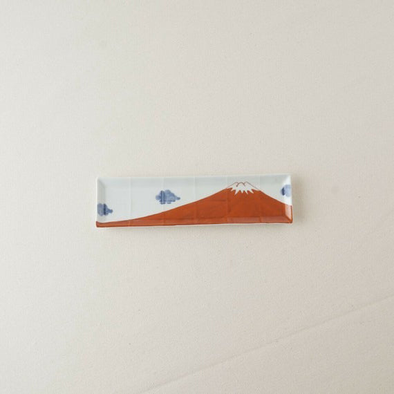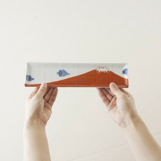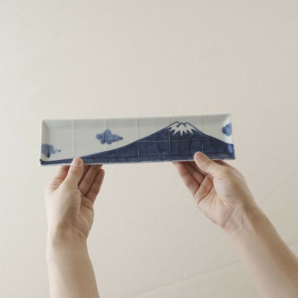 Crafted in the renowned ceramic region of Imari, this elegant long rectangular plate features a majestic depiction of Mount Fuji, capturing the essence of traditional Japanese aesthetics. Its smooth, refined porcelain texture and elongated design make it ideal for serving sashimi, assorted appetizers, or seasonal dishes. A perfect blend of function and beauty, this piece brings a touch of scenic poetry and Japanese charm to your dining table.