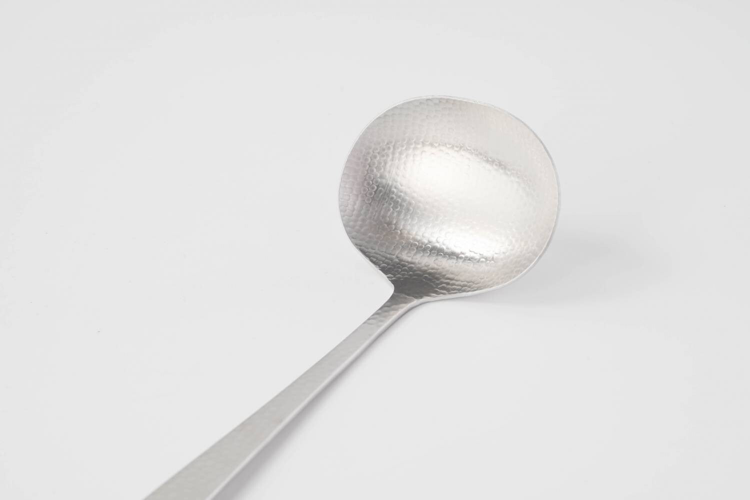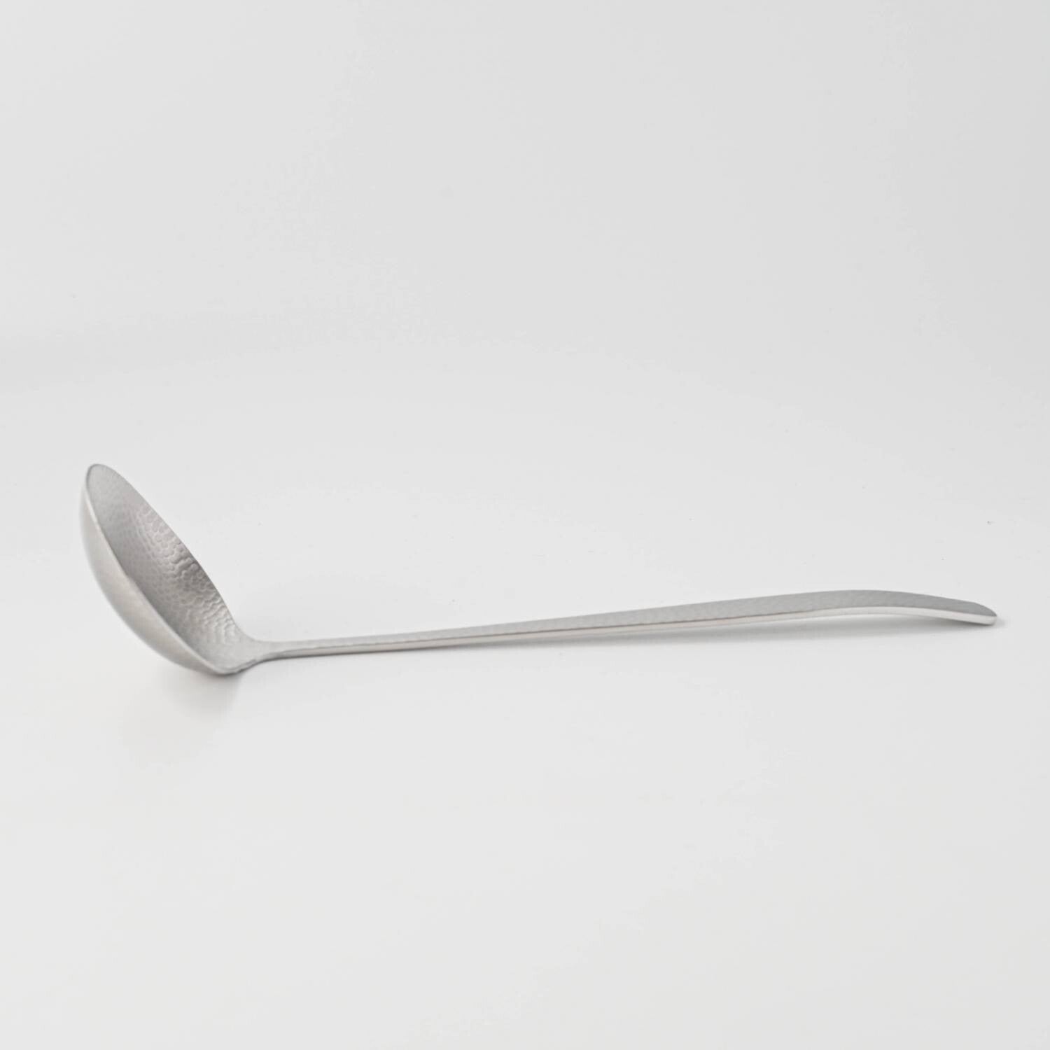 Featuring a beautifully hammered design, this ladle exudes elegant Japanese aesthetics. While perfect for traditional Japanese dishes, it also complements Western cuisine, adding a touch of sophistication to any meal. Its practical shape ensures comfortable handling, and the substantial weight enhances its premium feel. A must-have utensil for both everyday dining and special occasions, combining beauty and functionality seamlessly.