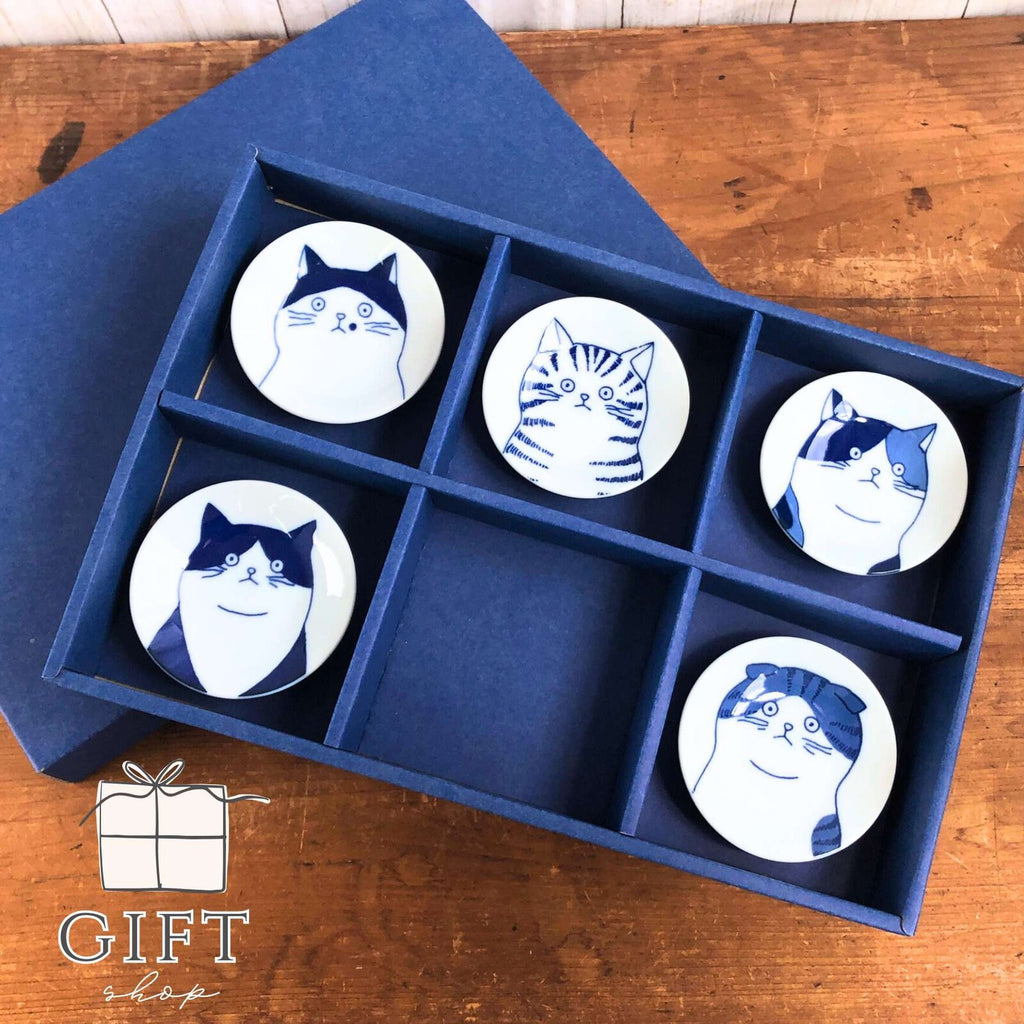 This Mino ware set includes five small plates, with each has a lovely cat on it. The blue glaze is beautifully applied to the smooth white ceramic clay. Each Shichita cat has its own cute expressions and body marks. The small size can be used as a sauce plate or a snack plate. Or place them on a tray to enjoy side dishes. The set is also a nice gift for cat lovers.